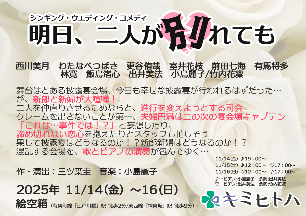 【情報解禁】旗揚げ公演「明日、二人が別れても」タイトル、あらすじ、日程、出演者 News X Bluesky Facebook はてブ LINE コピー 2025.10.27 Next旗揚げ公演 「明日、二人が別れても」2025 11/14(金)~16(日)絵空箱(有楽町線「江戸川橋」駅 徒歩2分/東西... 旗揚げ公演の情報が解禁されました。予約も開始しています。https://trkr.jp/ticket?p=ashifuta 特設サイトはこちらキャストの扮装ビジュアル等も少しずつ発表予定です。お楽しみに!