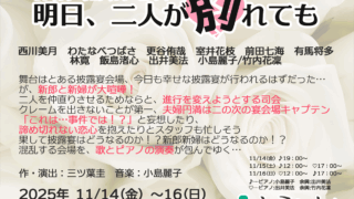 News 【情報解禁】旗揚げ公演「明日、二人が別れても」タイトル、あらすじ、日程、出演者 旗揚げ公演の情報が解禁されました。予約も開始しています。特設サイトはこちらキャストの扮装ビジュアル等も少しずつ発表予定で... 2025.10.27 News