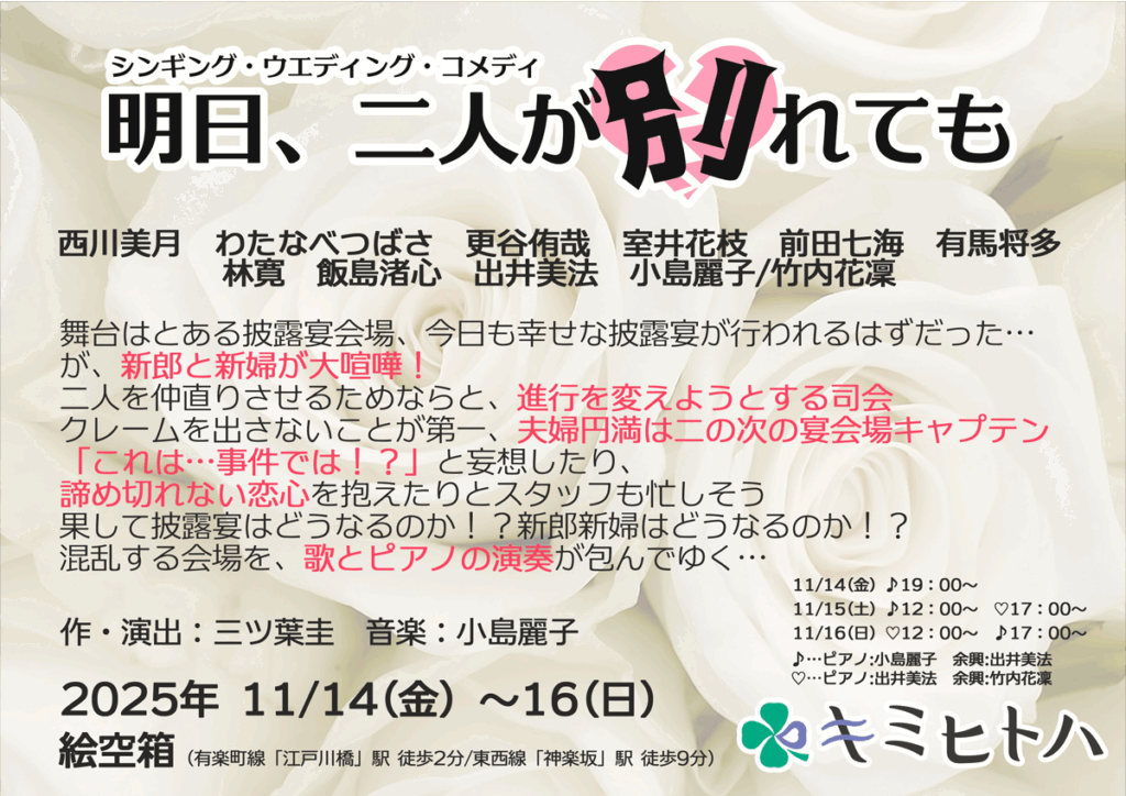 歌とピアノ演奏で彩る、臨場感あふれる披露宴コメディです。